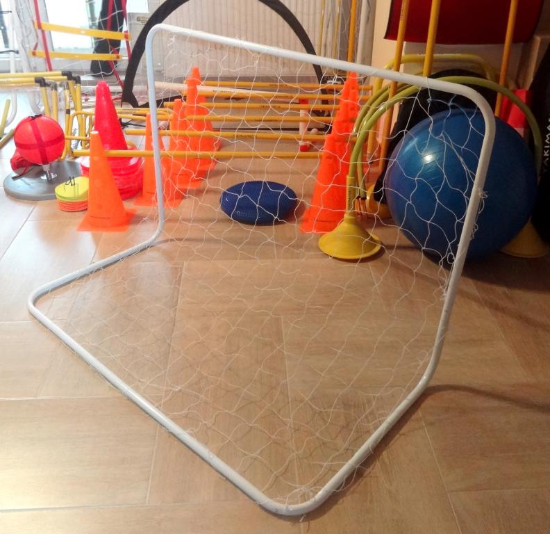? W skład zestawu wchodzi torba do przenoszenia złożonej bramki oraz haki do przytwierdzenia bramki do podłoża